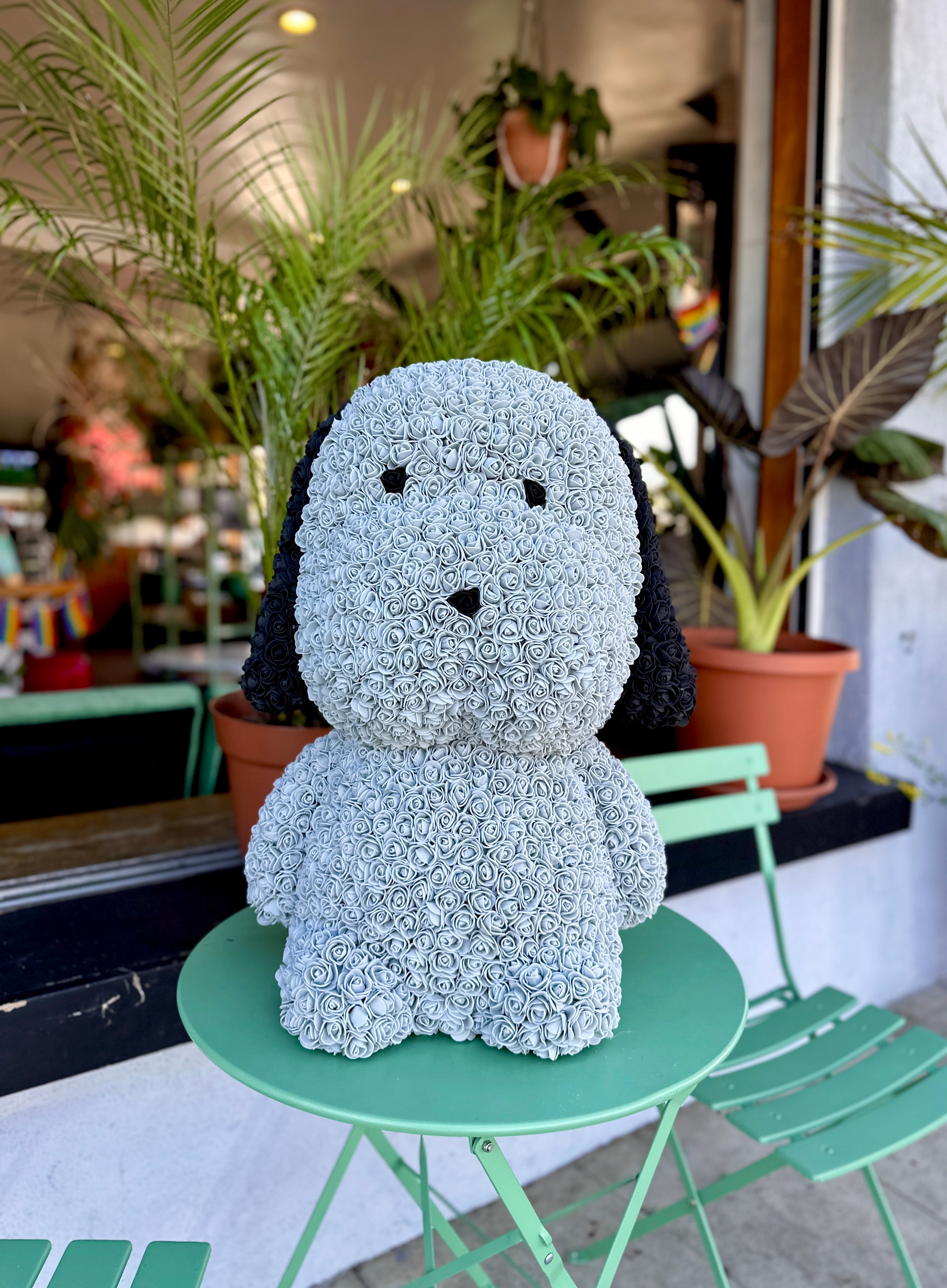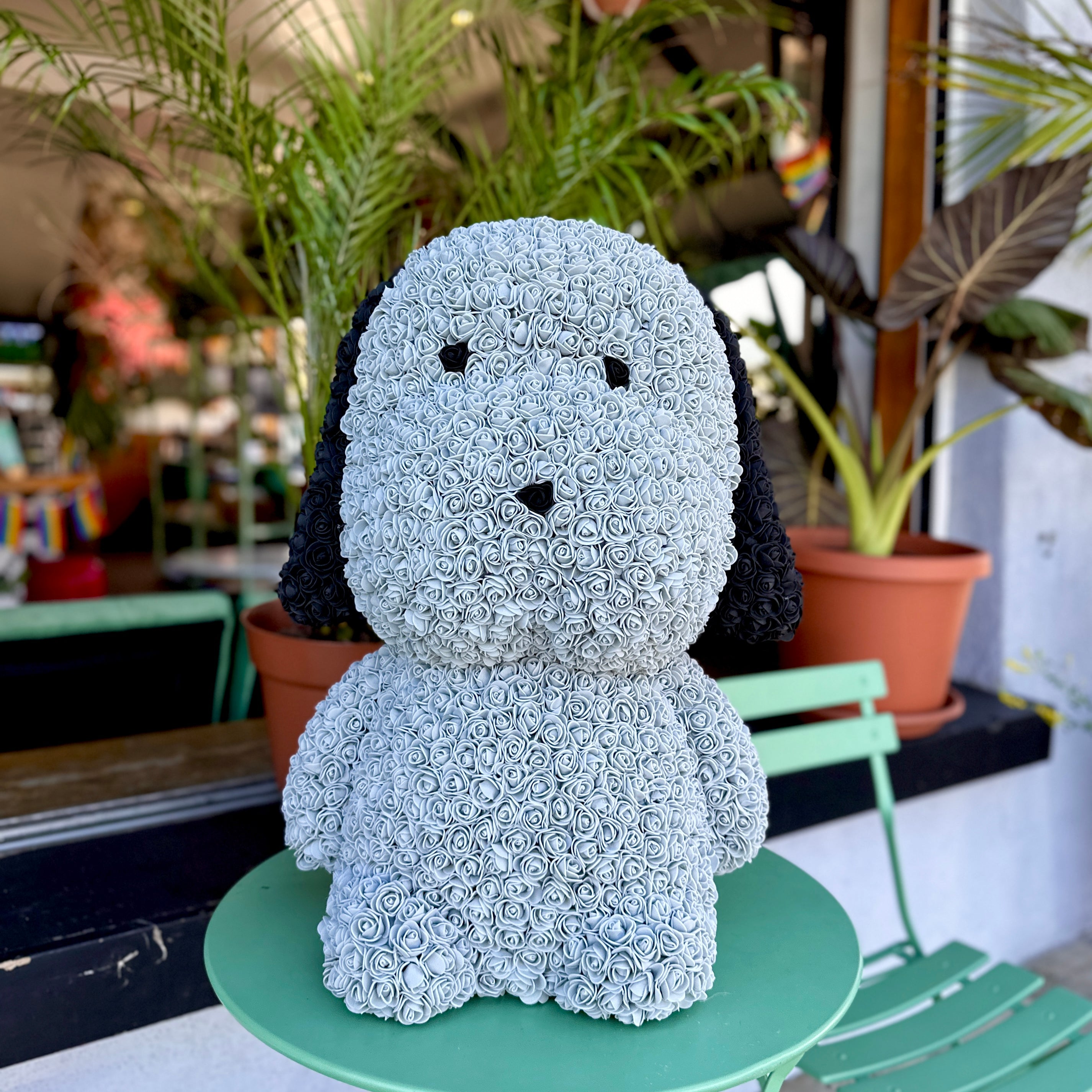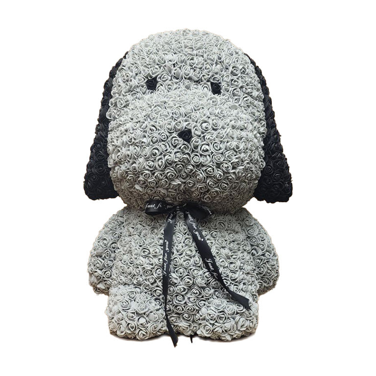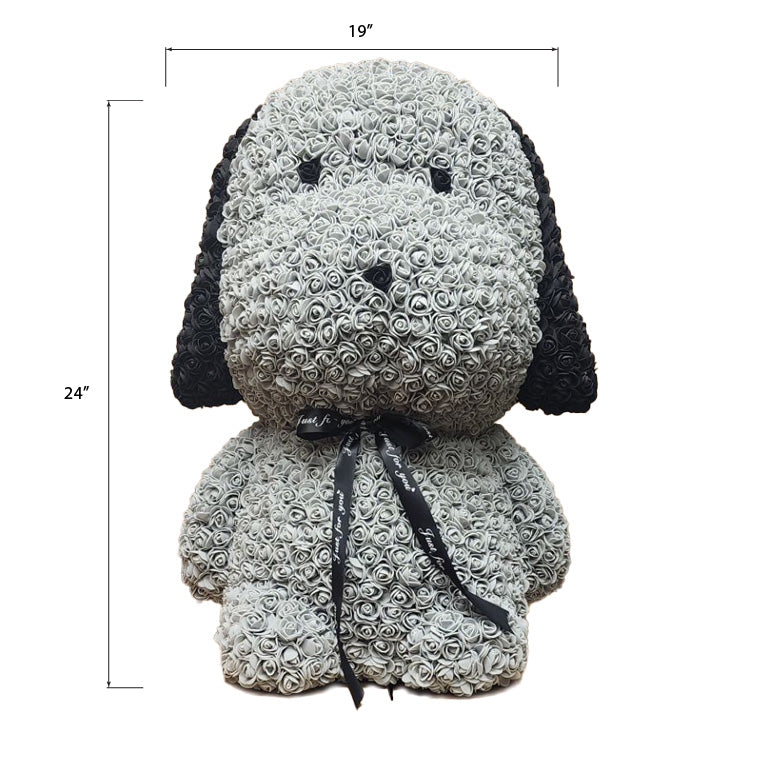 Send a unique and cute gift, carefully shaped from gray faux roses arranged to create a big, beautiful puppy.