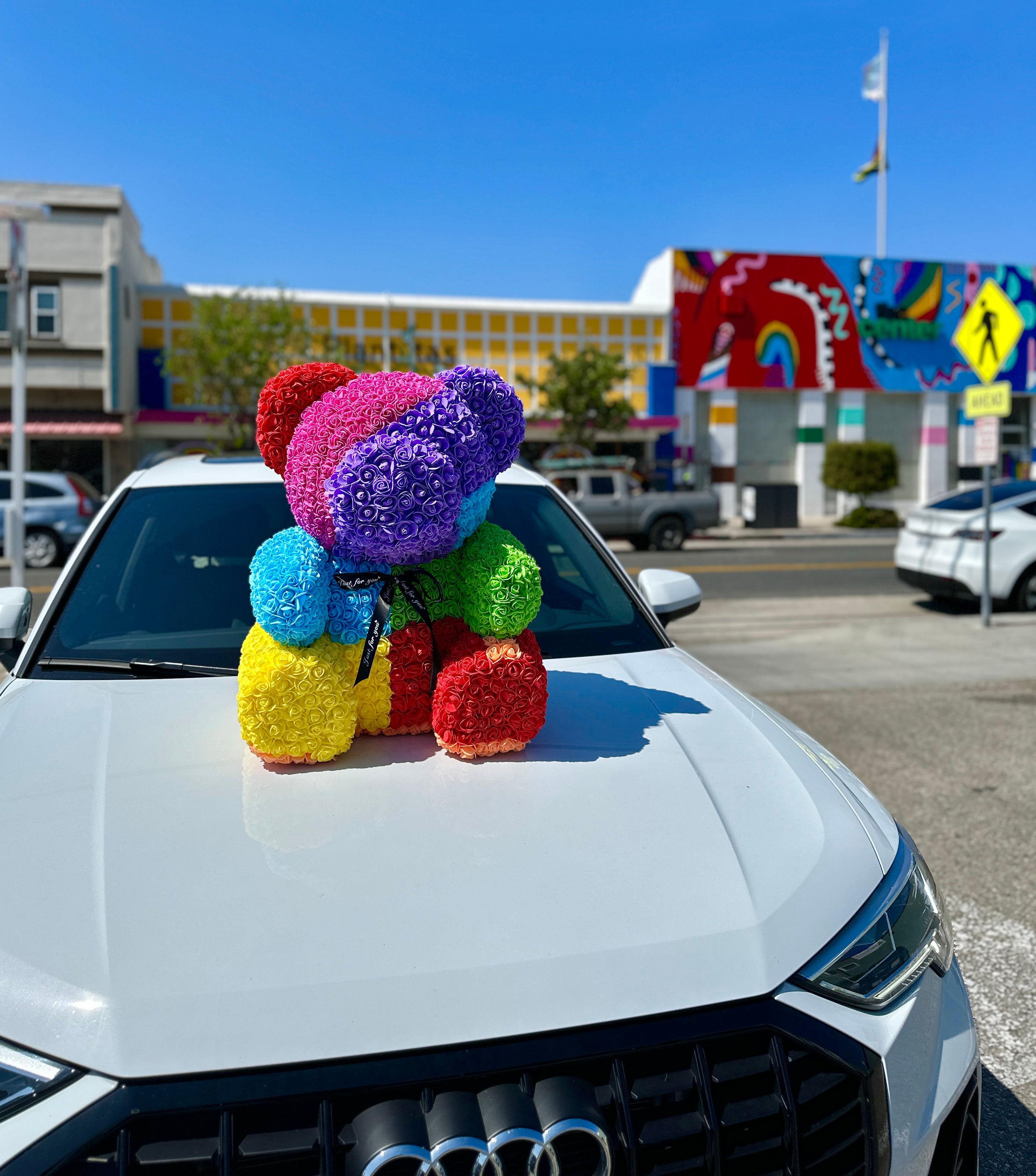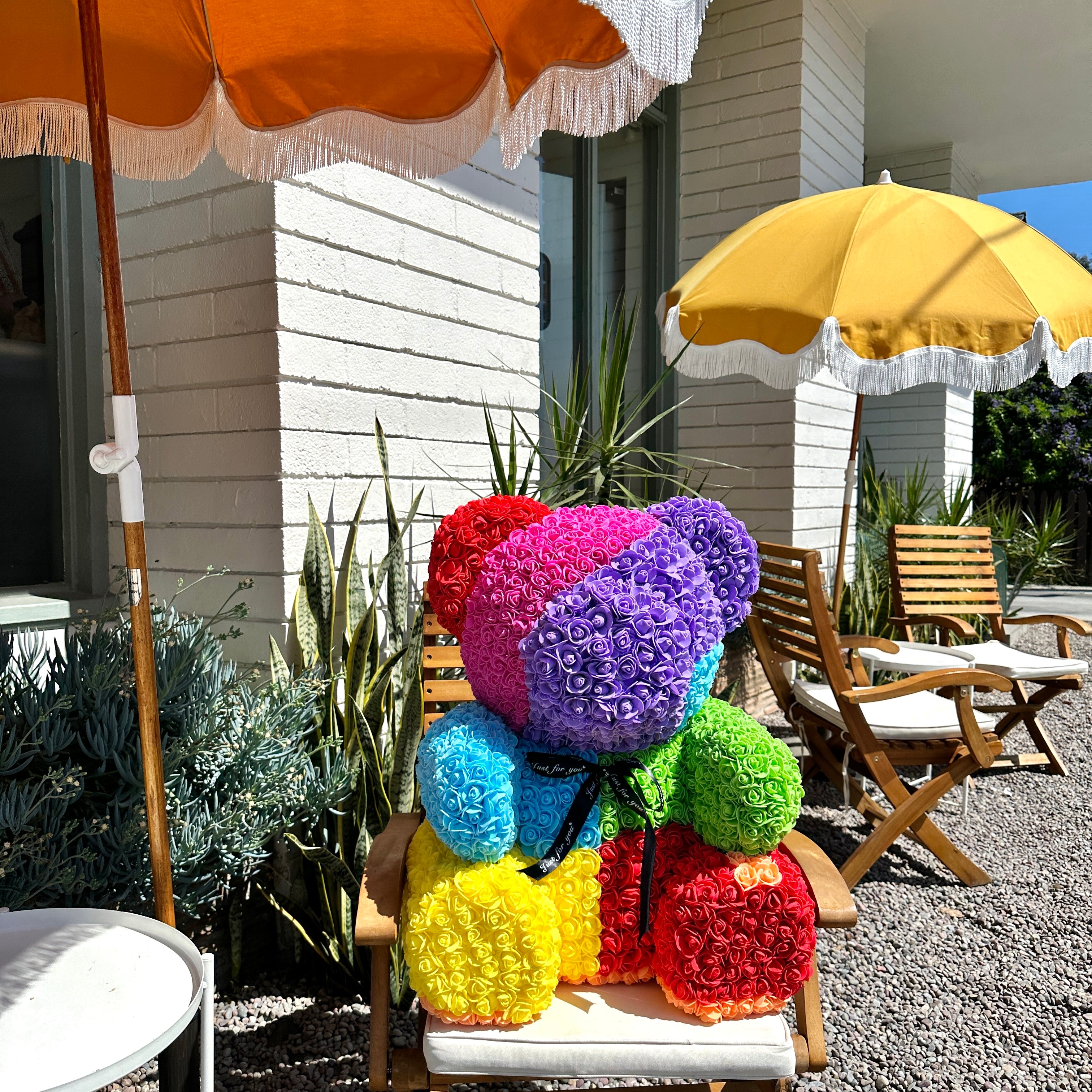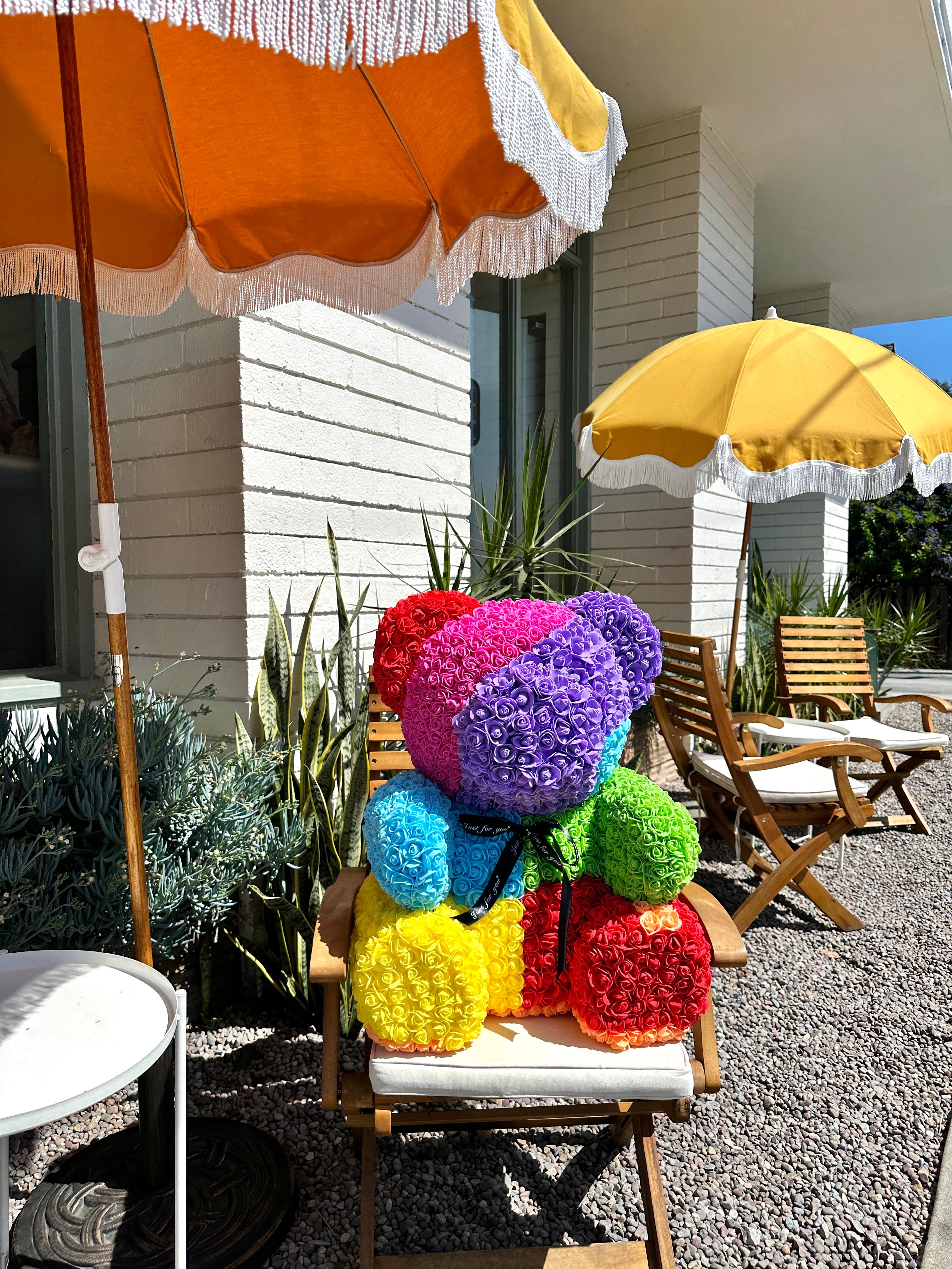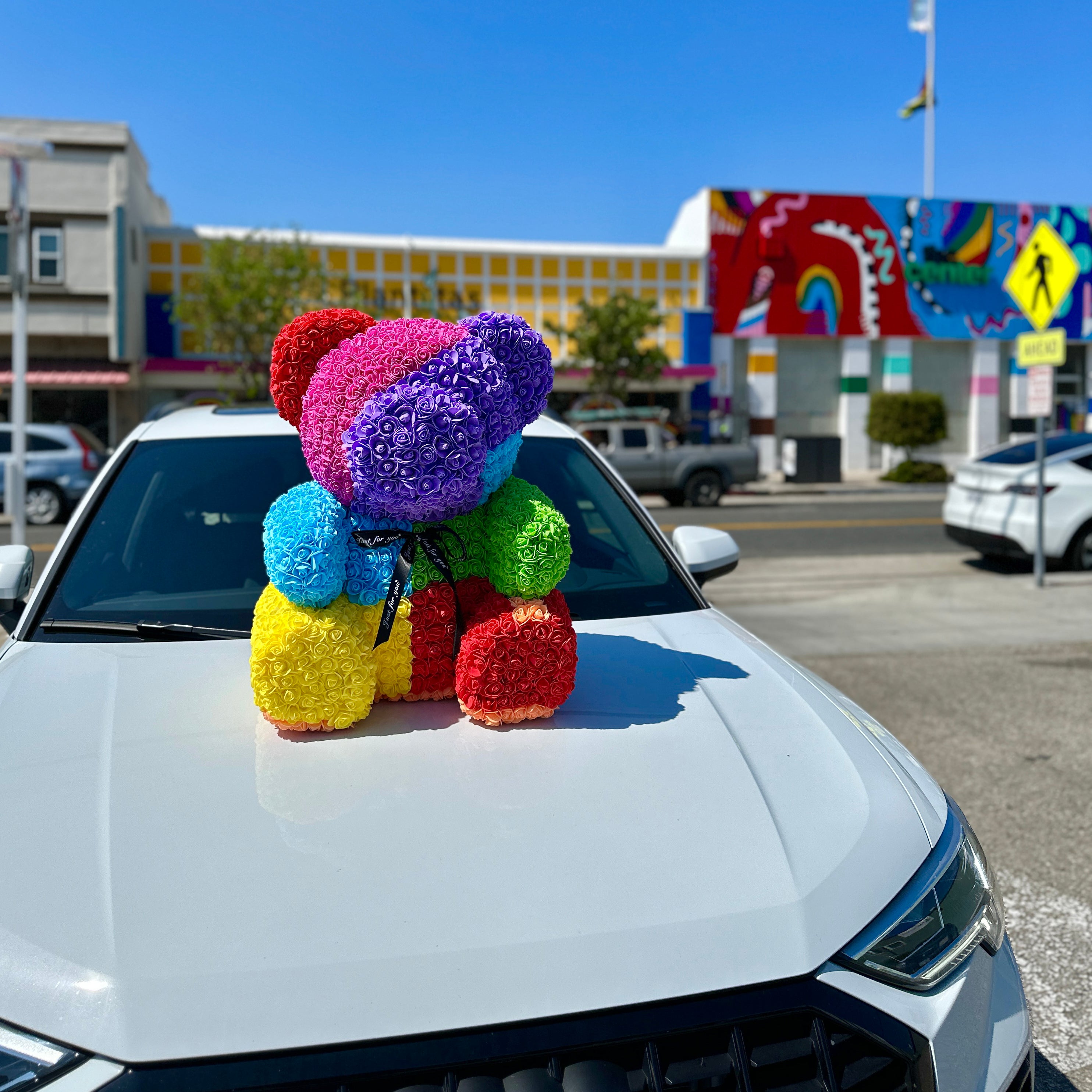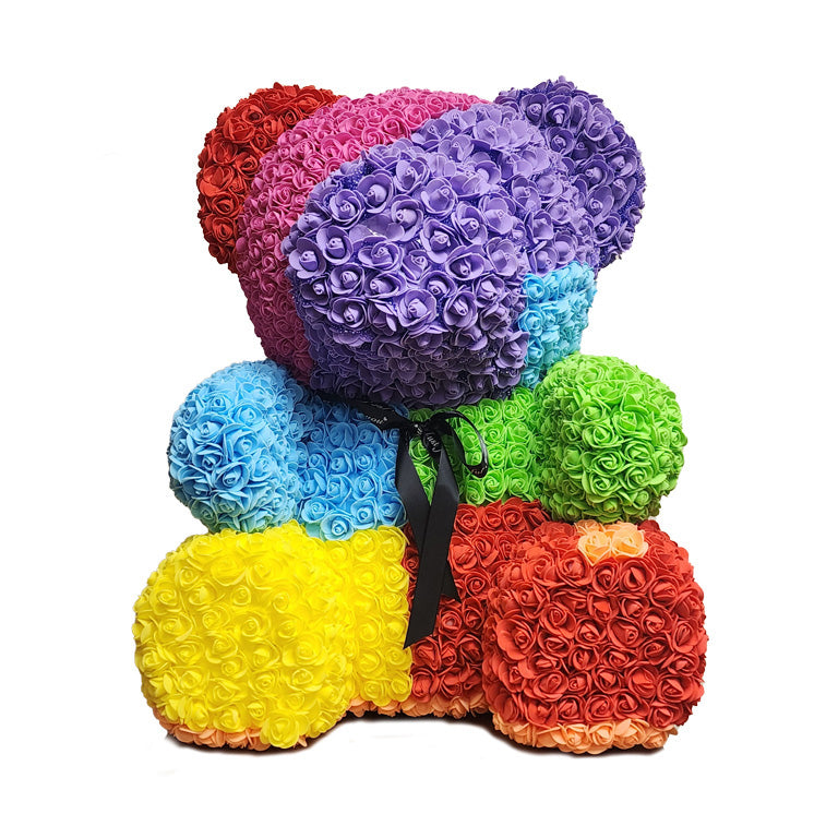 Send a unique and cute gift, carefully shaped from rainbow faux roses arranged to create a big, beautiful bear.