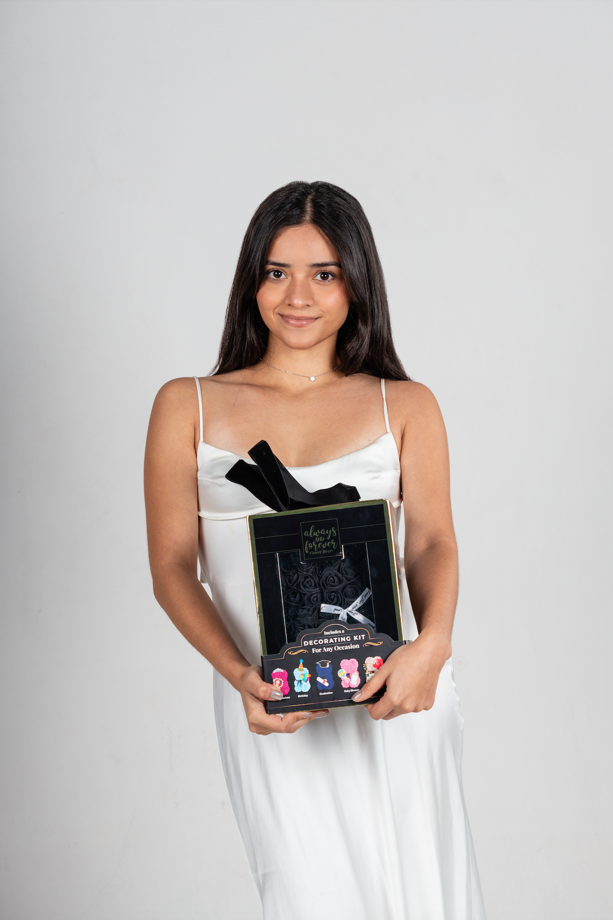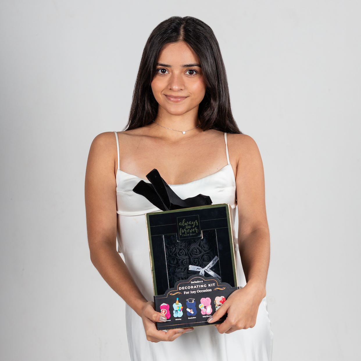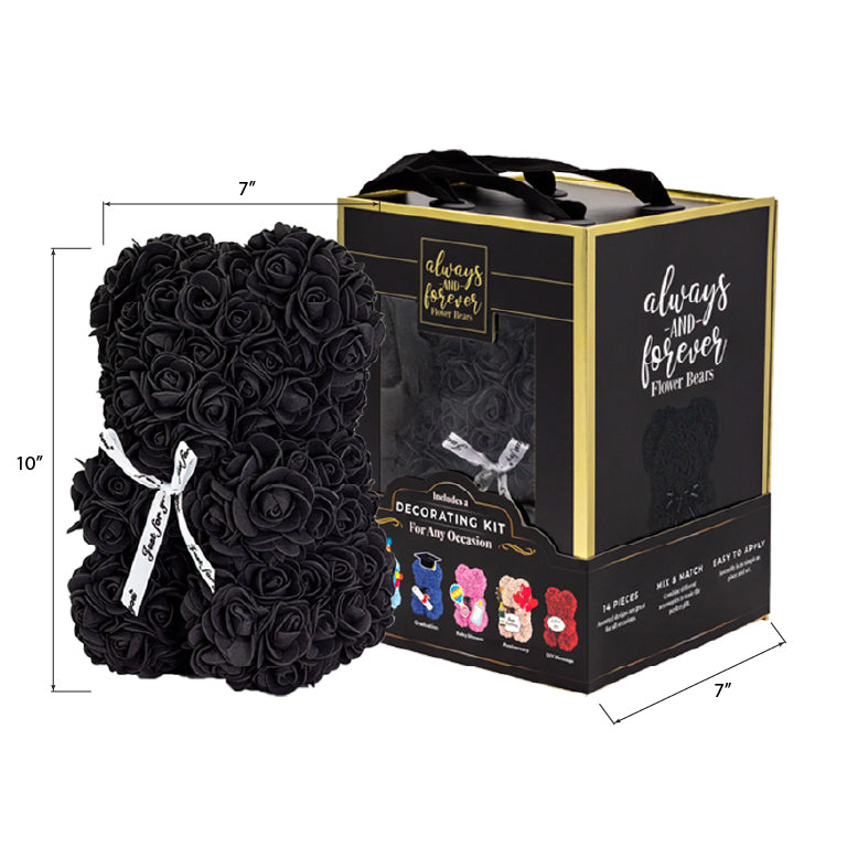 Flower bear with decorating kit accessories in an elegant box marked "Always and Forever." Perfect for personalizing gifts for anniversaries, birthdays, graduations, Christmas, Valentine’s Day, and other special occasions or decoration. A thoughtful gift that lasts forever.