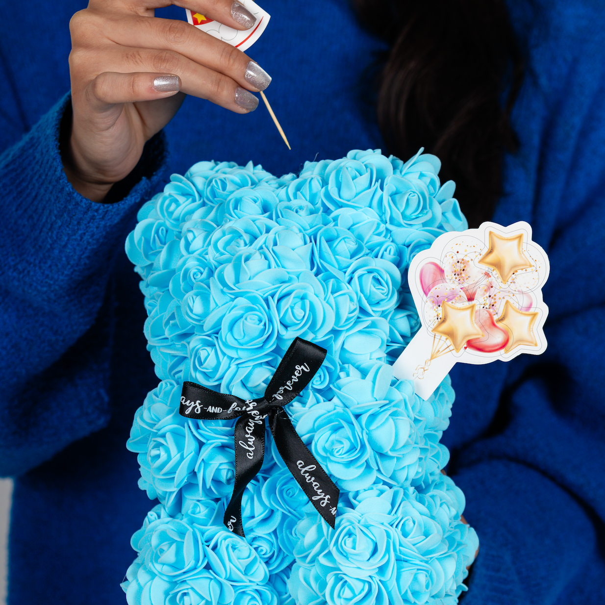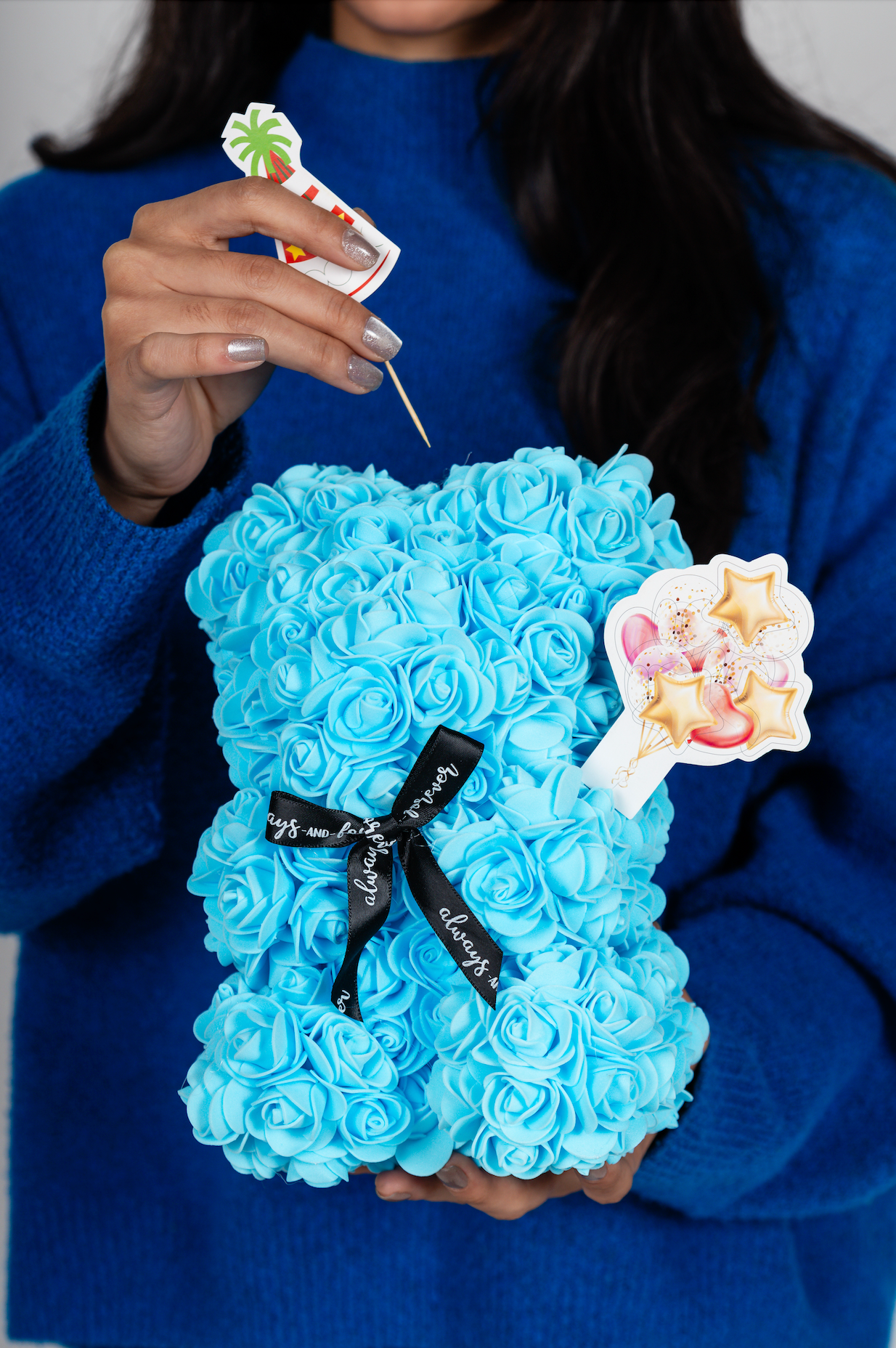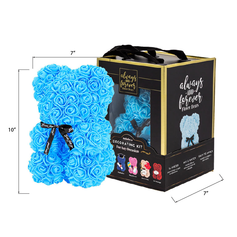 Flower bear with decorating kit accessories in an elegant box marked "Always and Forever." Perfect for personalizing gifts for anniversaries, birthdays, graduations, Christmas, Valentine’s Day, and other special occasions or decoration. A thoughtful gift that lasts forever.