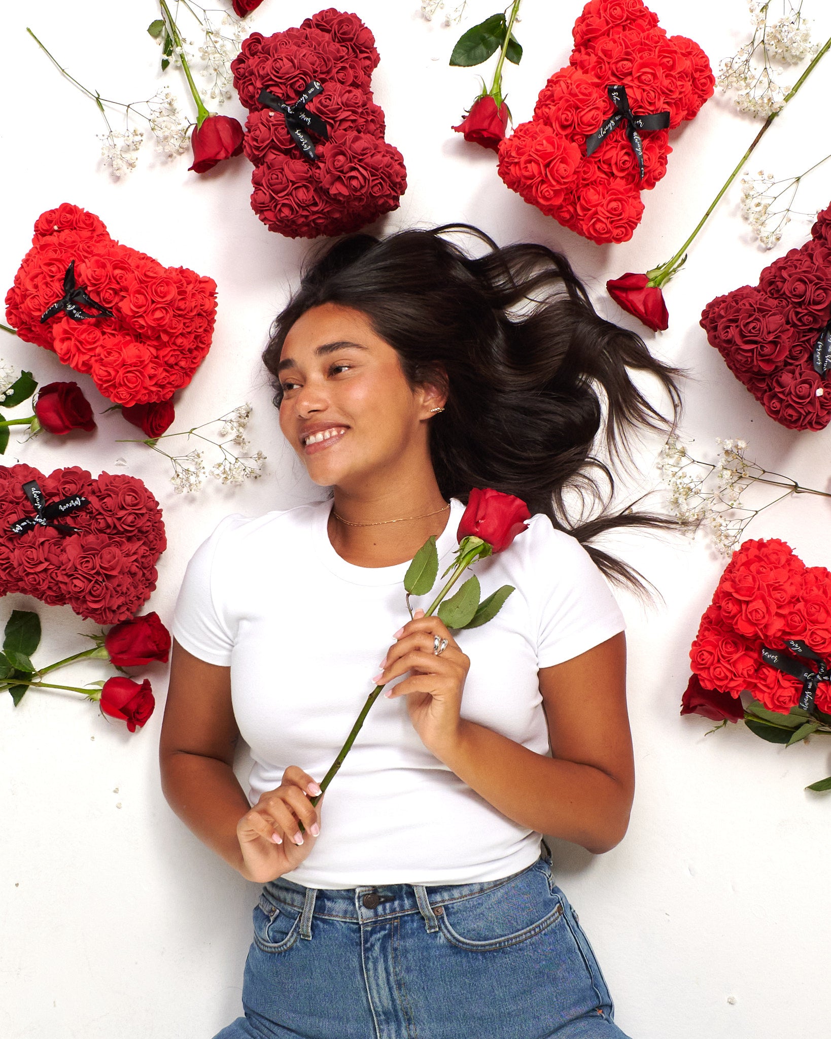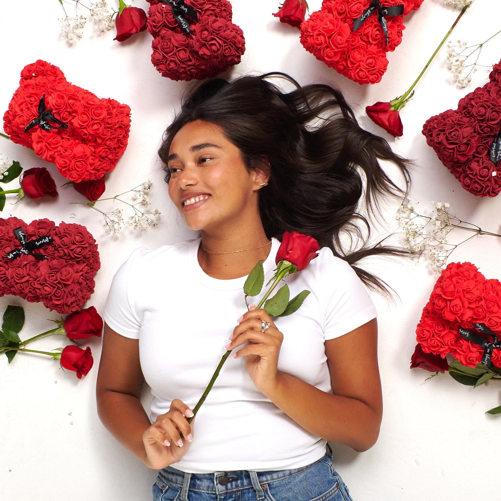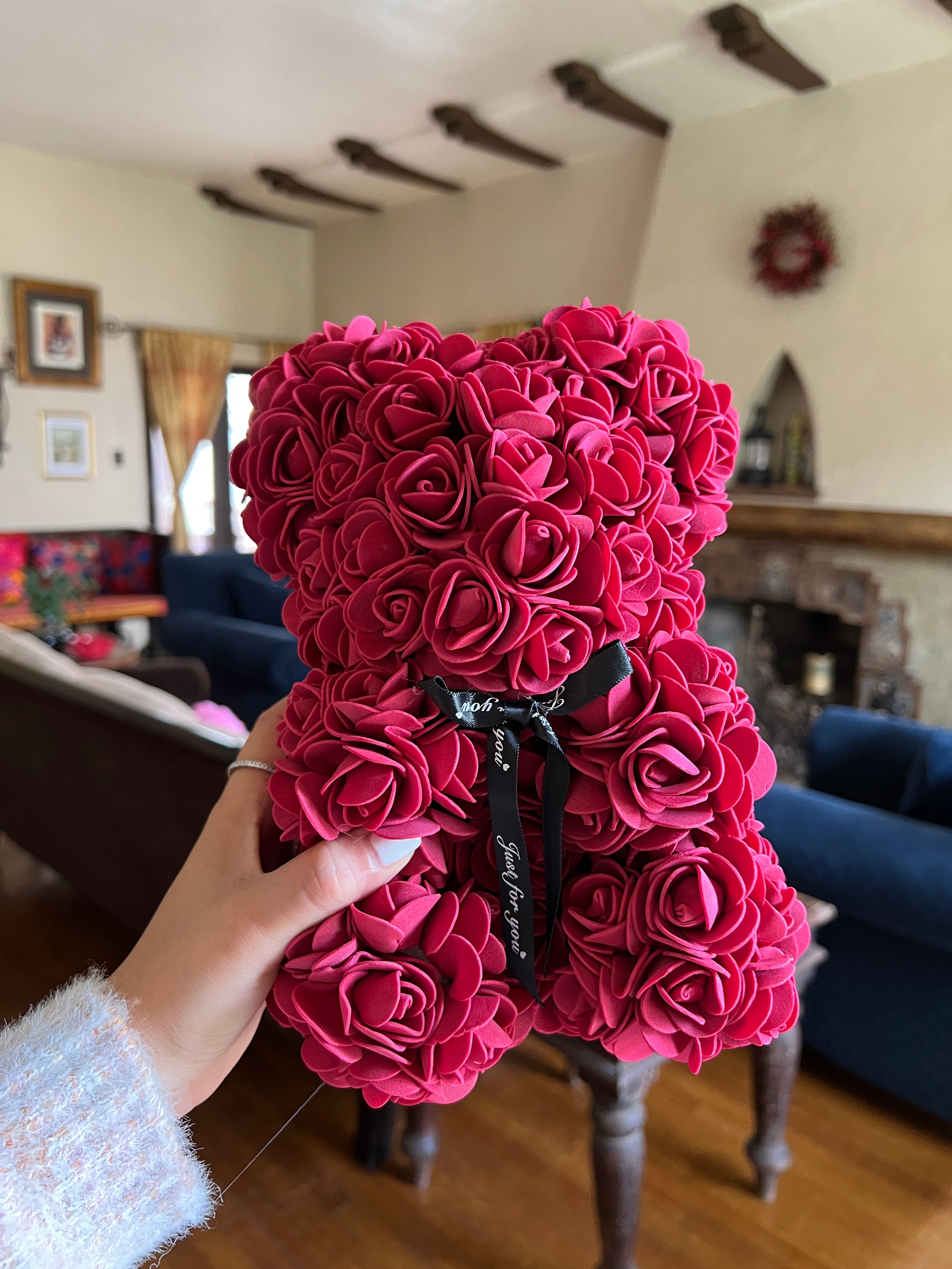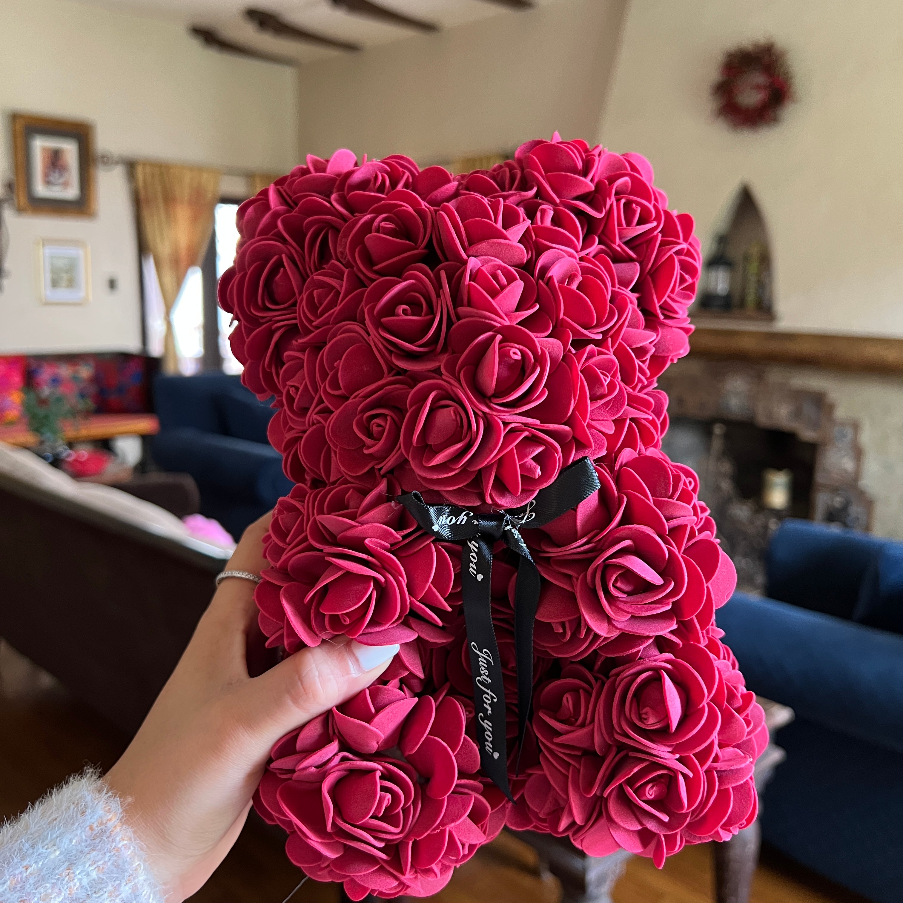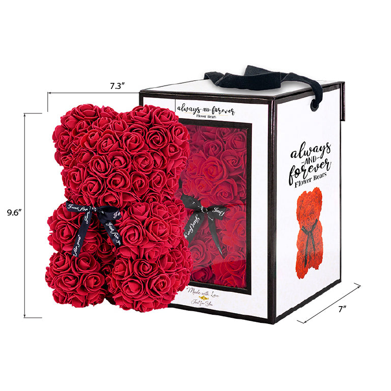Celebrate any special occasion with a perfect gift that lasts forever. Our flower bears are carefully crafted with burgundy faux roses presented in a luxurious box.