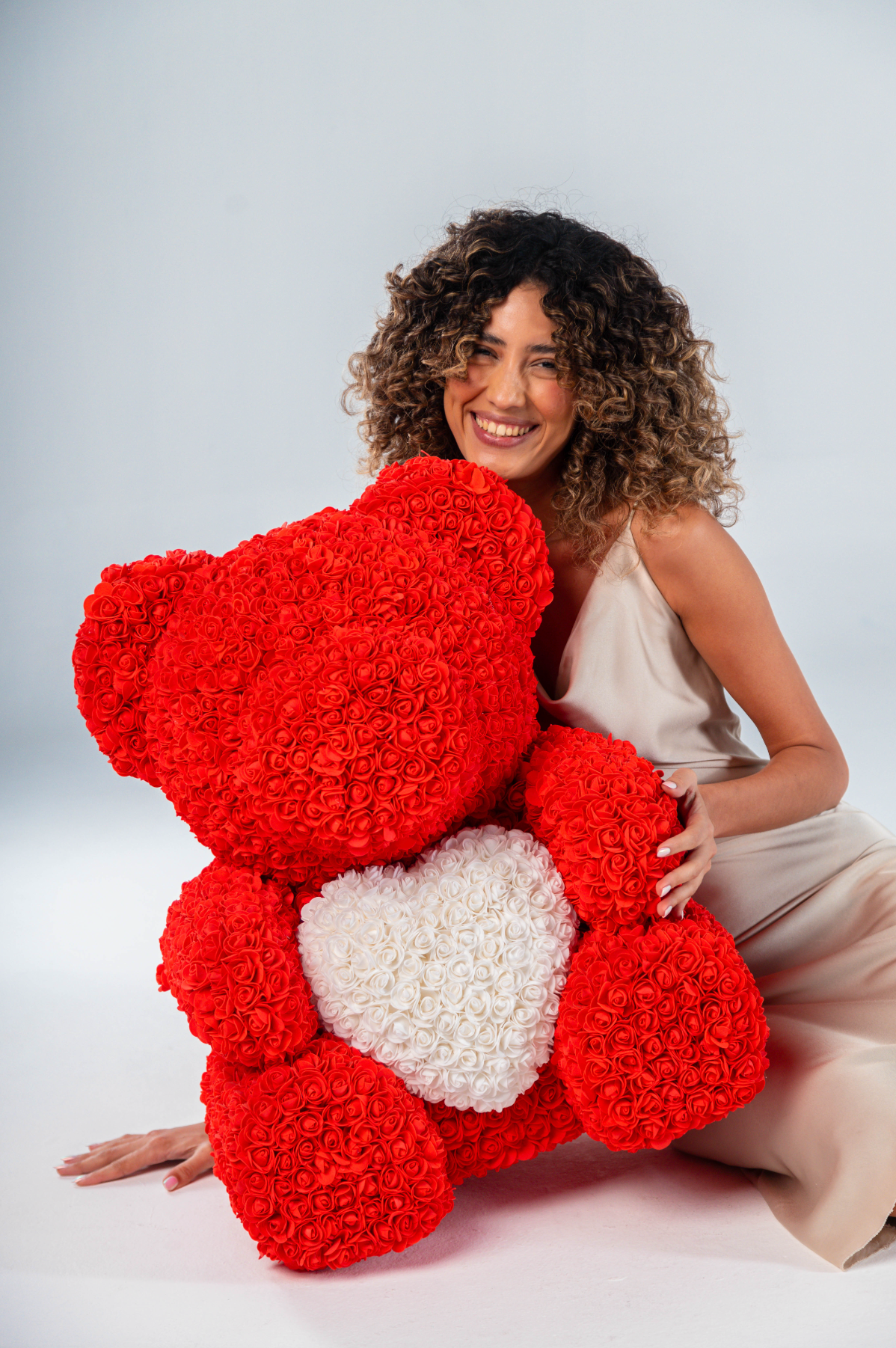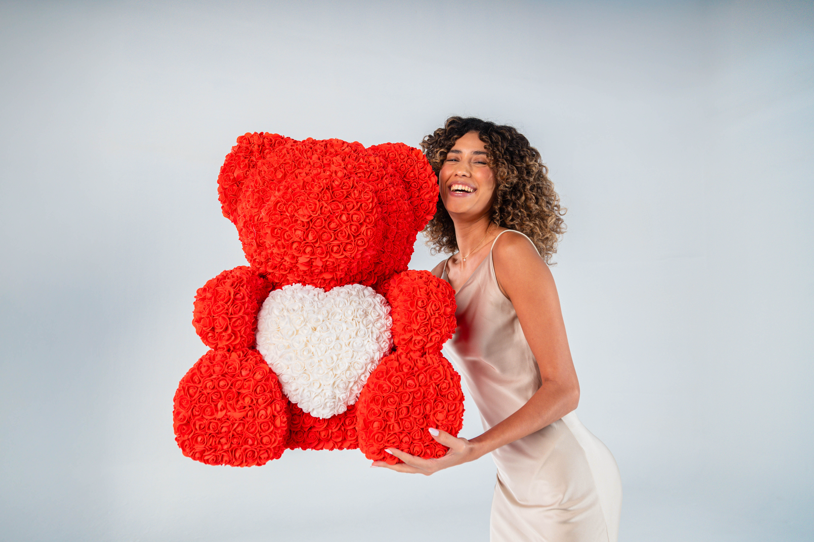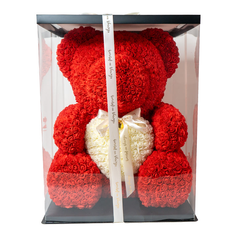 Make any moment special with this charming large-sized bear, beautifully crafted from vibrant red faux roses. Its eye-catching design and thoughtful details make it the perfect gift for a variety of occasions.