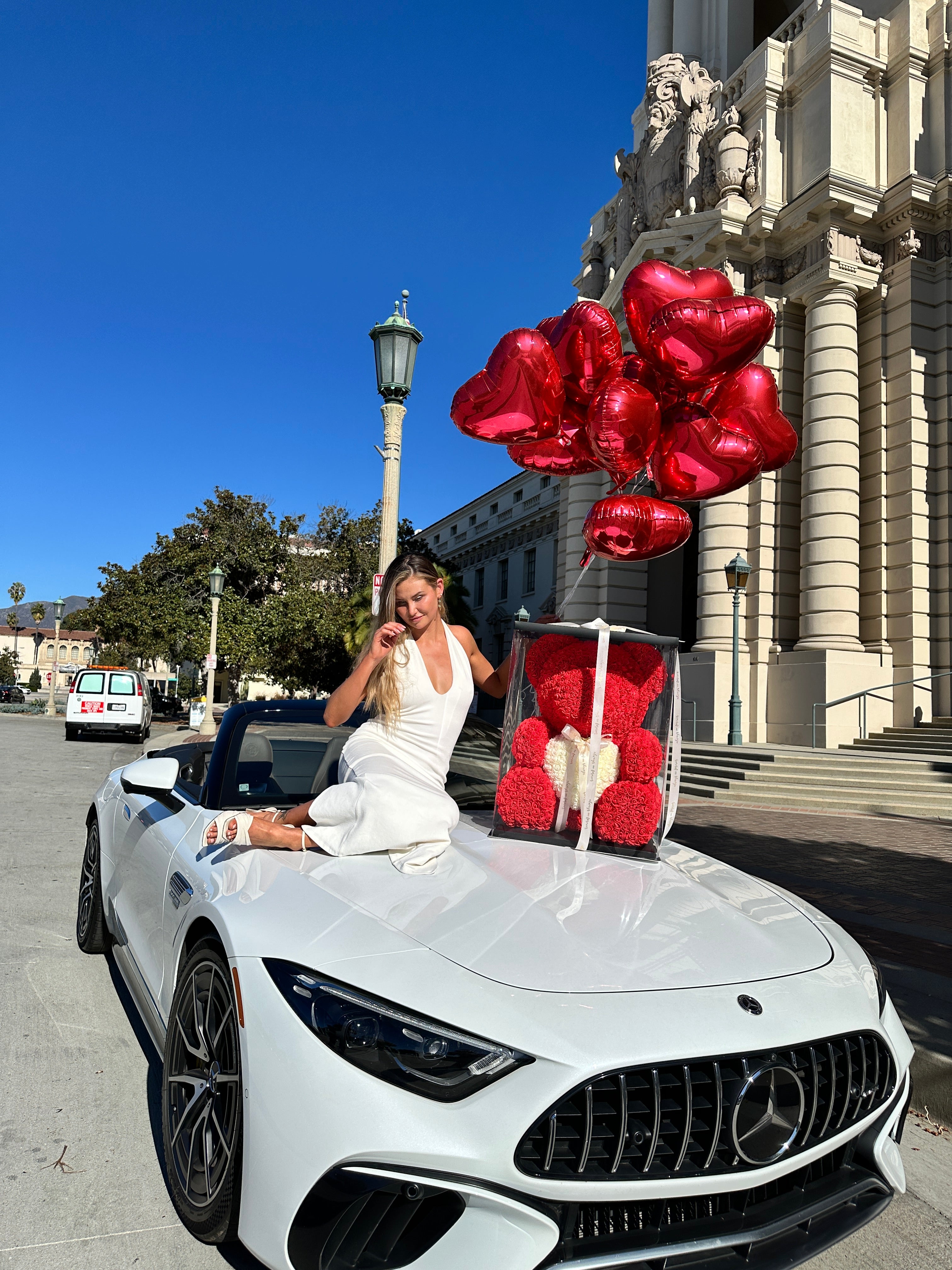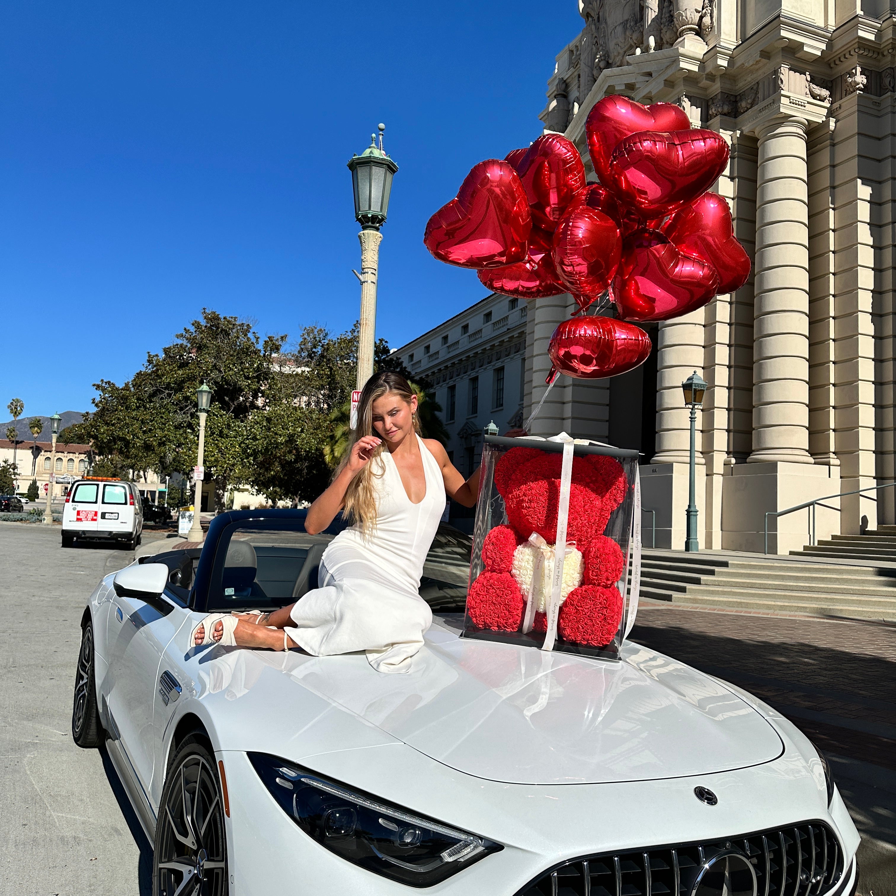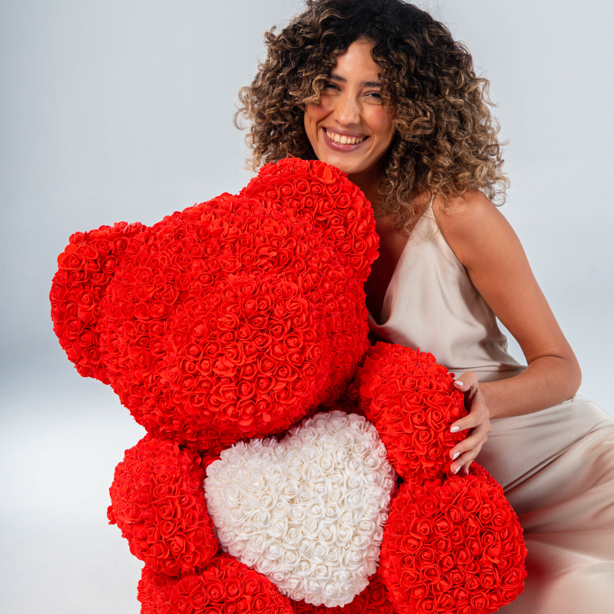 Make any moment special with this charming large-sized bear, beautifully crafted from vibrant red faux roses. Its eye-catching design and thoughtful details make it the perfect gift for a variety of occasions.