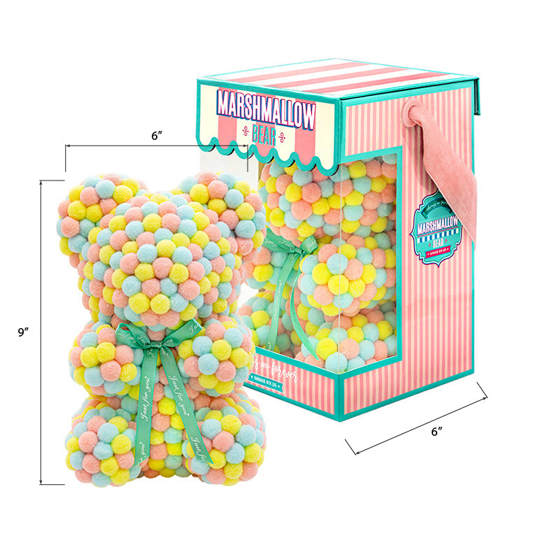 Bear made out of pink, yellow and blue-colored faux marshmallows. The bear is adorned with a green ribbon tied into a bow around its neck, and it is packaged in a clear-front gift box with a pink and white striped design. The top of the box features a teal and pink label that reads "MARSHMALLOW BEAR." This delightful creation is an excellent gift idea for various occasions such as anniversaries, birthdays, graduations, Christmas, Valentine's Day, or simply as a unique gift for someone special.